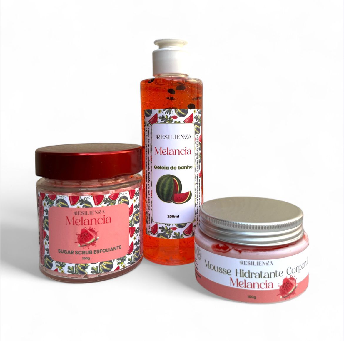 Com um perfume suculento e energizante, o Kit Melancia foi criado para quem ama frescor e bem-estar. Ele proporciona uma limpeza delicada, uma esfoliação revigorante e um toque de carinho para a pele, tudo isso com o cheirinho doce e vibrante da fruta que é a cara do verão.